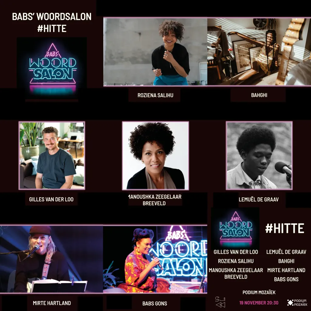 Klamme handen, klotsende oksels en opvliegers. Broeierige aanrakingen en hitsige gedichten. Verhitte discussies over smeltende poolkappen op een steeds warmer wordende aarde. Heet onder onze voeten door dreigende hoge stookkosten. Belooft de koude zomer zonder hittegolf een strenge winter? Hoe dan ook maken we het heet, heter, heetst bij Babs’ Woordsalon. In deze muzikale woordrevue komen performers uit verschillende nesten samen: van spoken word-artiesten en schrijvers tot songwriters en dichters. Deze keer zijn te gast: Gilles van der Loo, Lemuël de Graav, Roziena Salihu, Manoushka Zeegelaar Breeveld en Bahghi. Ze worden ontvangen door gastvrouw Babs Gons en muzikale host Mirte Hartland om het te hebben over het thema HITTE. Kom op 19 november naar Podium Mozaïek en koop je tickets hier!