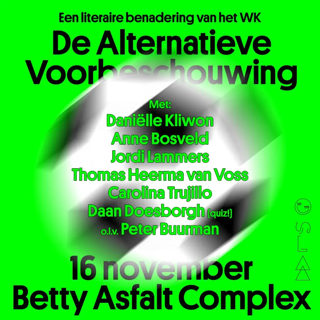 Das Mag en SLAA bundelen de krachten voor een literaire voetbalavond over het WK 2022 in Qatar. Met de volgende rits sterspelers: Peter Buurman, Danielle Kliwon, Jordi Lammers, Anne Bosveld, Thomas Heerma van Voss, Carolina Trujillo en Daan Doesborgh, wiens quiz natuurlijk niet kan ontbreken.