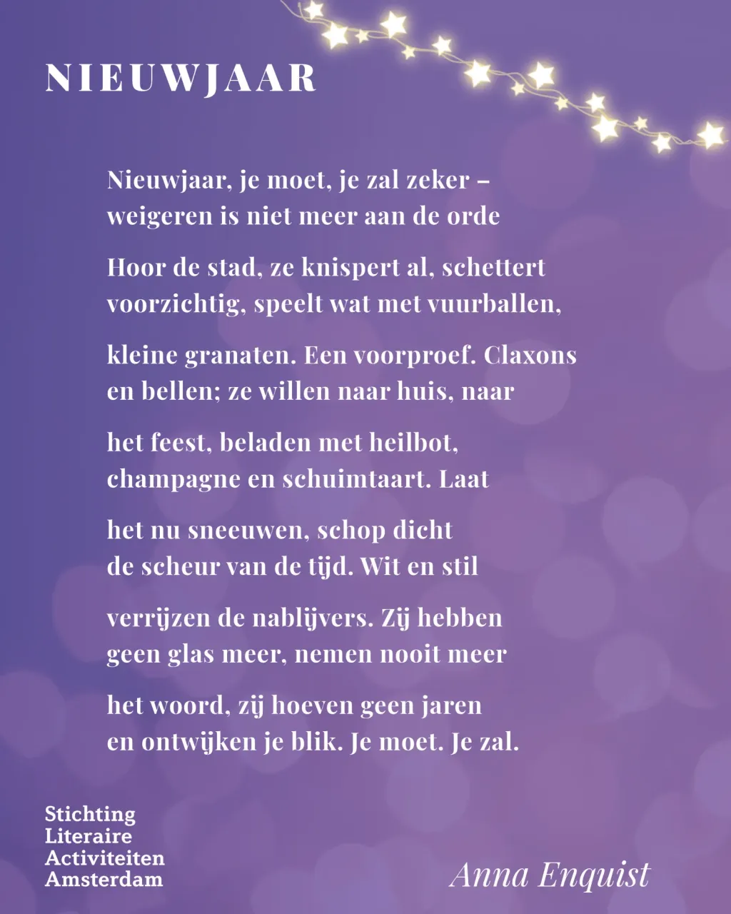 Anna Enquist was van 2014 tot 2016 Stadsdichter van Amsterdam. Met haar prachtige gedicht ‘Nieuwjaar’ wensen we iedereen heel fijne kerstdagen en een vrolijk 2023 vol poëzie! ‘Nieuwjaar’ is ook opgenomen in Enquists bundel Hoor de stad, verschenen bij De Arbeiderspers in 2015. We wensen jullie allemaal een fijne kerst! Miriam, Maya, Sarah, Nora en Afra'Claxons/ en bellen: ze willen naar huis, naar/ het feest, beladen met heilbot,/ champagne en schuimtaart’.